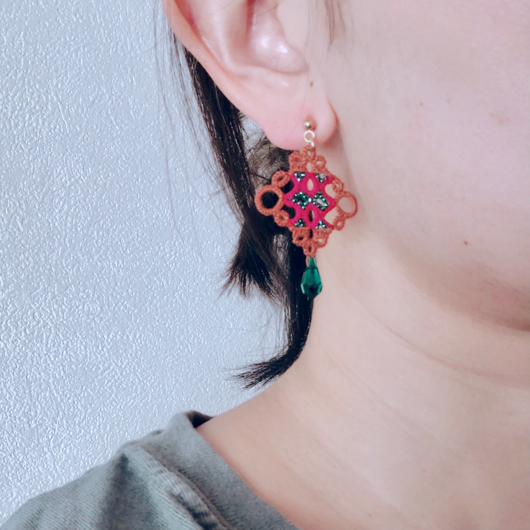 タティングレースのピアス Lamp<ランプ>Brown × Green ※イヤリングに変更可