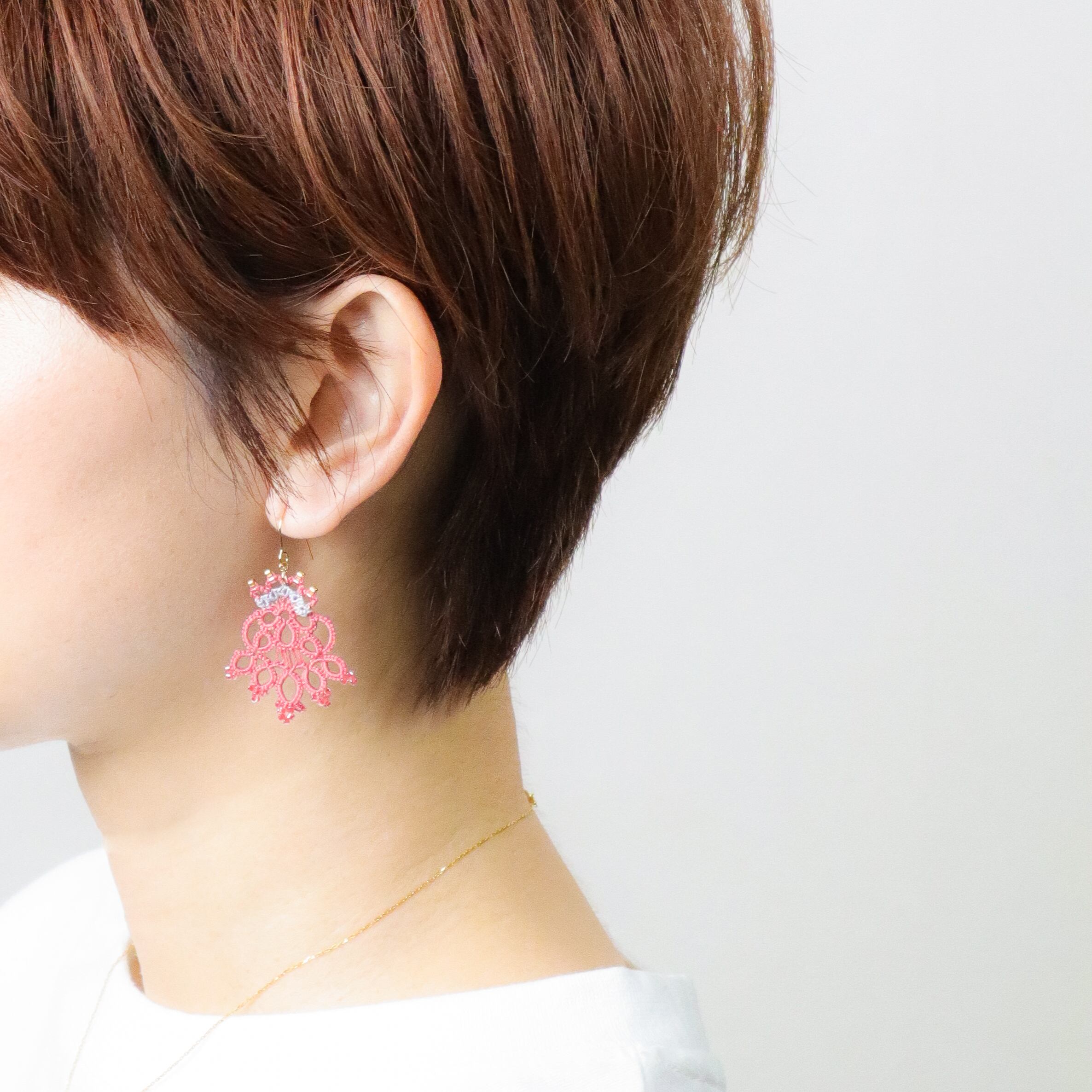 タティングレースとビーズのピアス Rococo<ロココ>Coral ※イヤリングに変更可