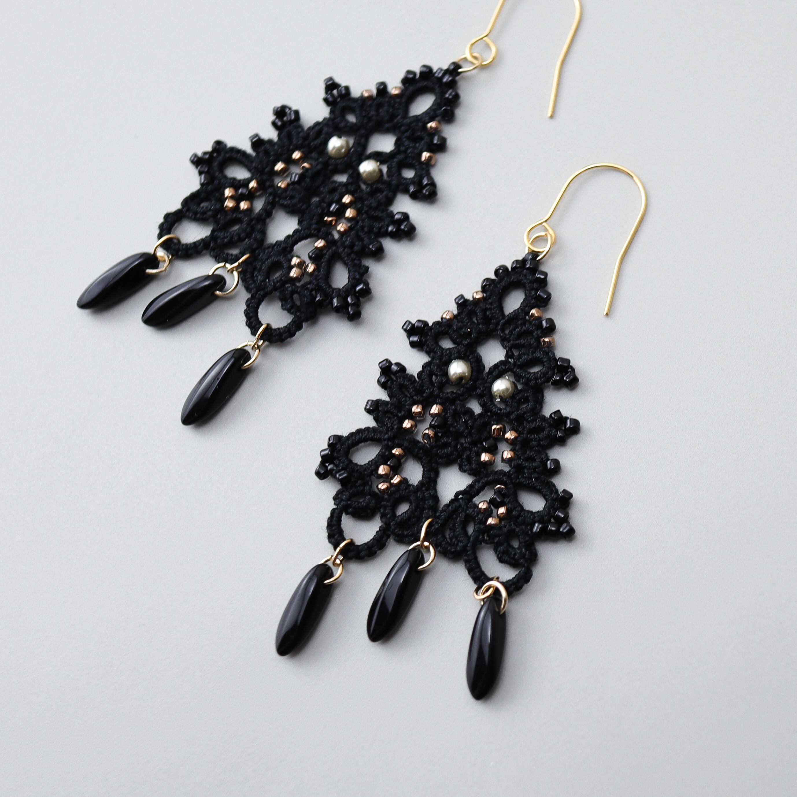 タティングレースとビーズのピアス Chandelier<シャンデリア> Black ※イヤリングに変更可